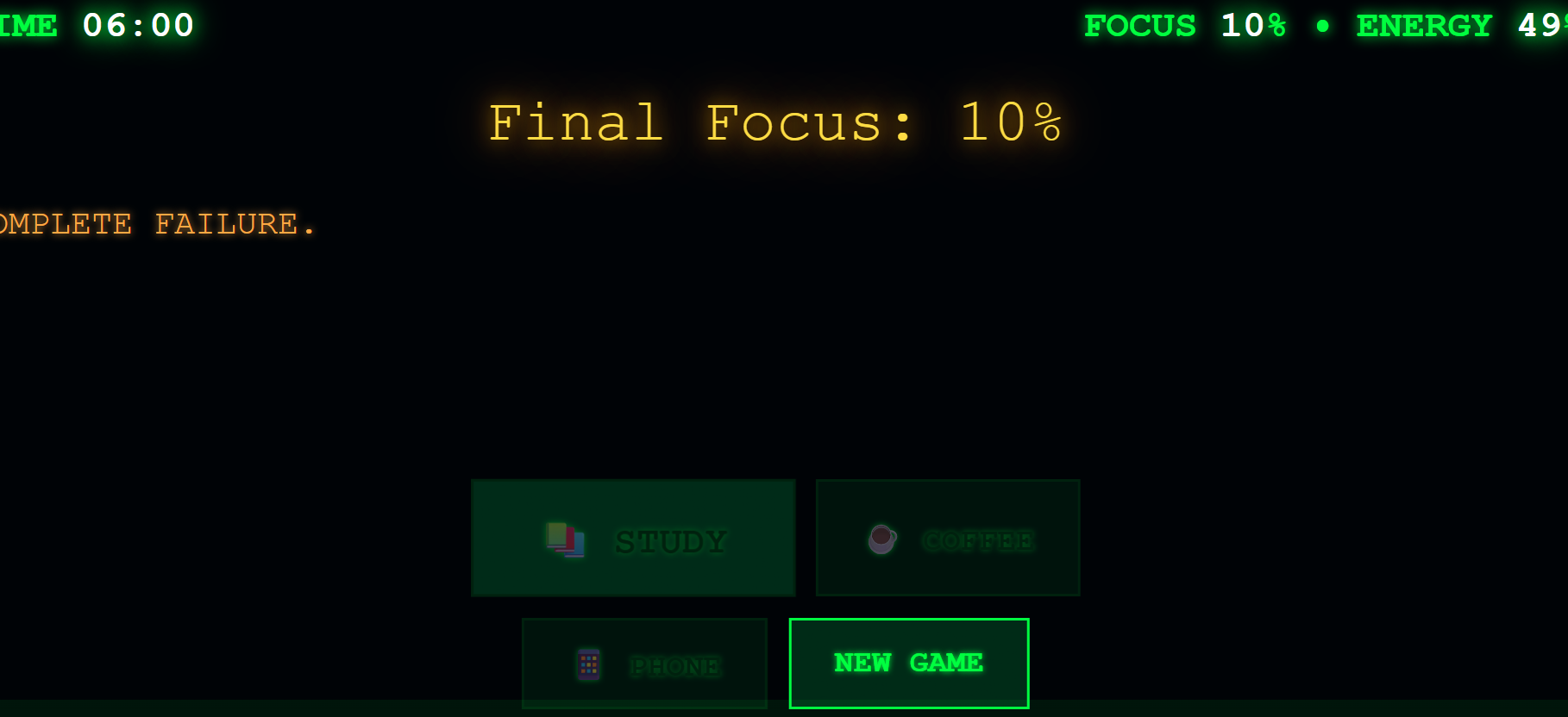 - Spam STUDY (big green button / click anywhere / WASD/Arrows) → +FOCUS, -ENERGY.