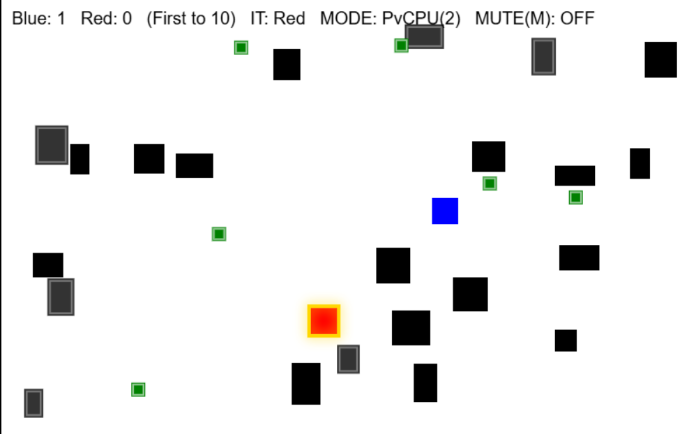 A fast-paced 2D tag game where two players (or a player vs computer) chase and evade each other in an arena full of obstacles. Collect speed boosts, avoid moving blocks, and tag your opponent to score points; first to 10 wins. Simple controls, arcade vibes, and quick, competitive rounds.